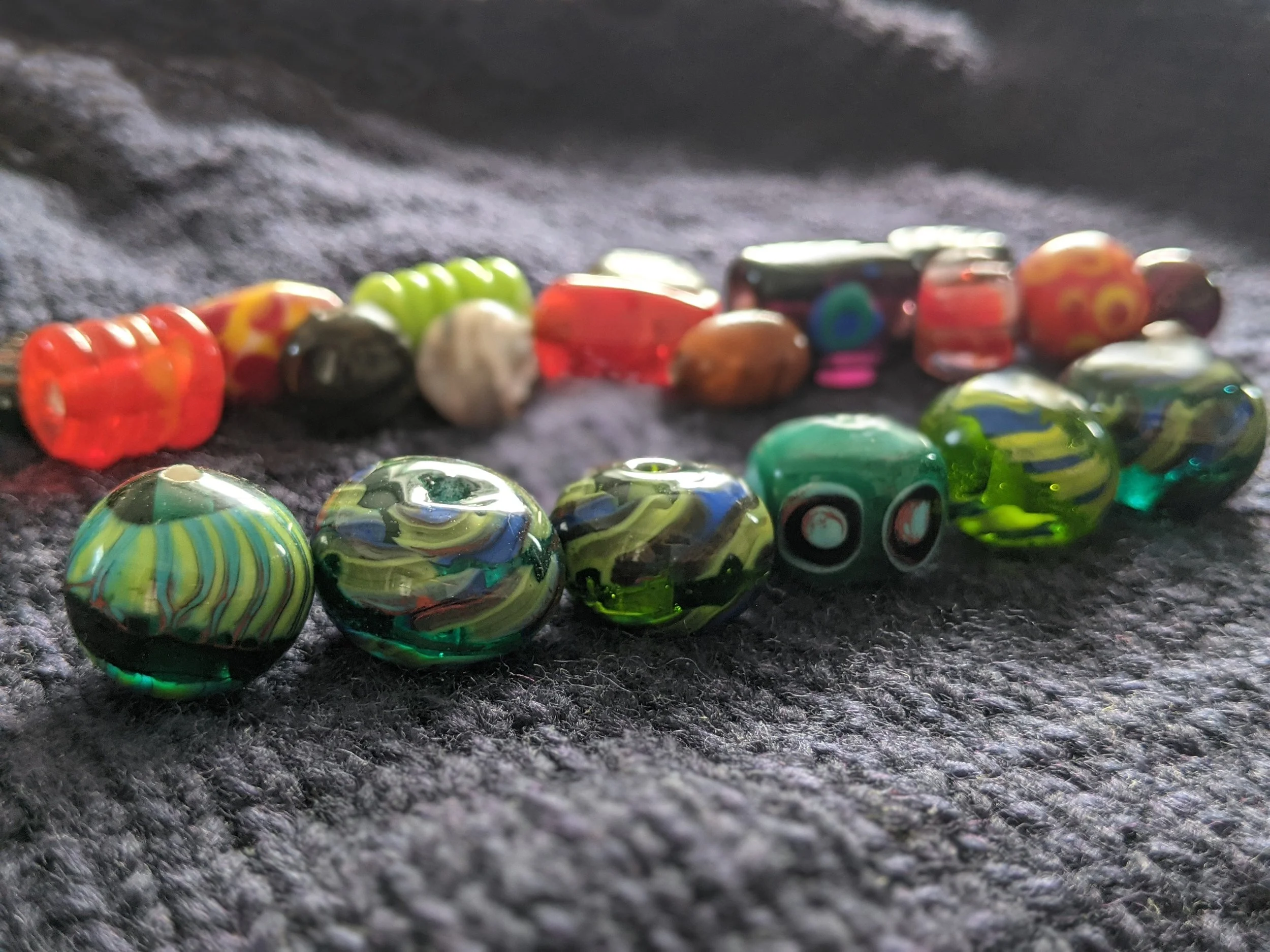 Je fabrique des billes de verre à l’aide d’une torche (lampwork). Je les utilise principalement pour créer des marqueurs de rang, qui sont utilisés lors de projets de tricot.